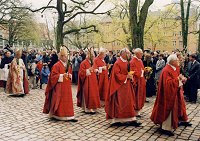 Besonders die Segnung des neuen, vom Münchner Bildhauer Max Faller geschaffenen Domportals durch Bischof Dr. Dammertz im Anschluss an die Prozession, erfreute die Gläubigen. Bischof Dr. Dammertz bezeichnete dieses neue Portal als eine Tür des Glaubens, "als eine Schwelle, über die wir in das neue Jahrtausend, in das dritte Jahrtausend der christlichen Geschichte schreiten". Diese durchschritt er schließlich - Hand in Hand mit dem Künstler Max Faller und dessen Ehefrau - um im Dom die Liturgie mit der Lesung und der Verkündigung der Leidensgeschichte Jesu fortzusetzen. |